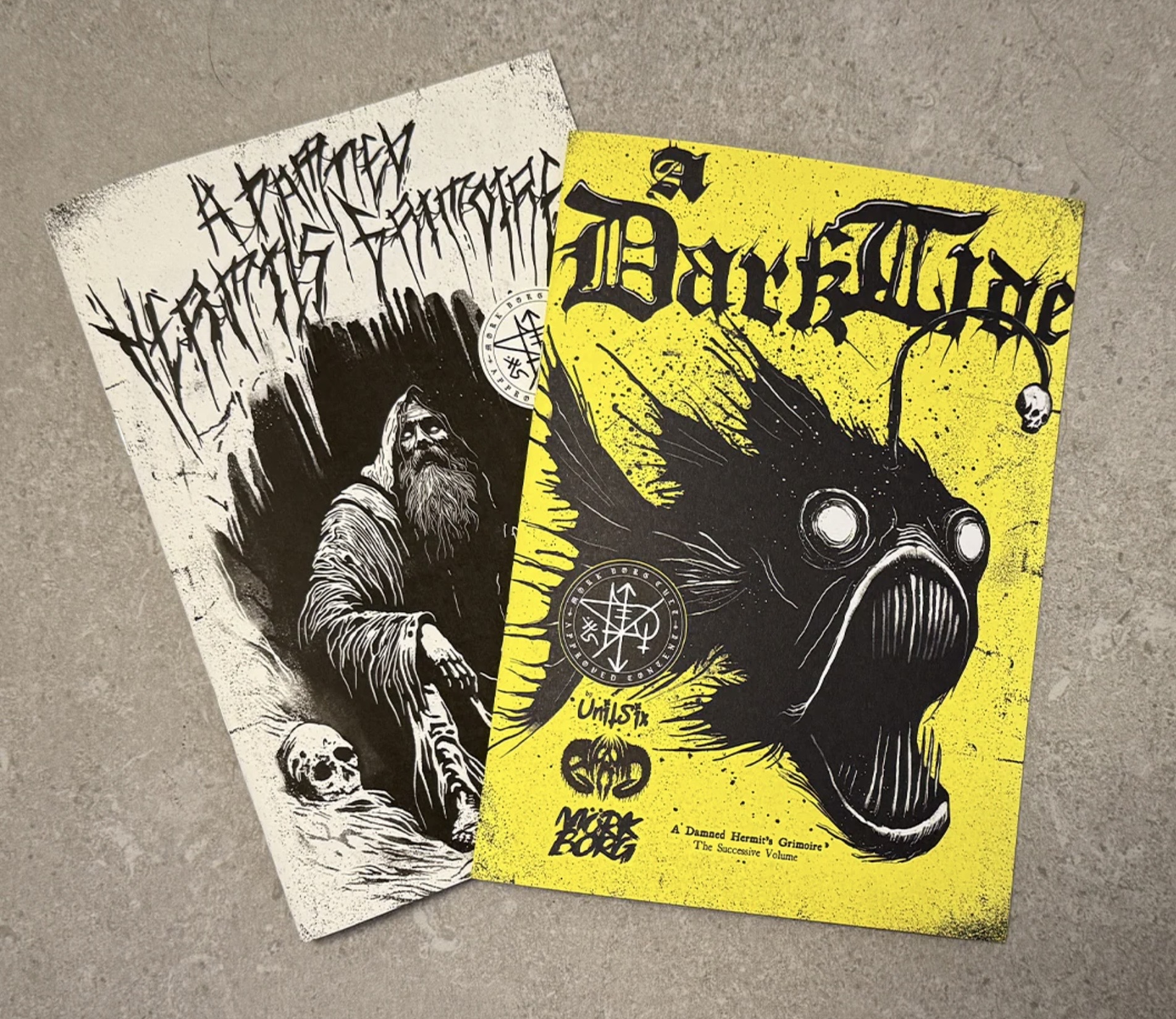 A Dark Tide is a mini, black, red, yellow and white, zine compatible with Mörk Borg. 2nd in a series, The Damned Hermits Grimoire, but completely stand alone (you don't need the first). Intended to be simple to print and staple at home. It includes a collection of;